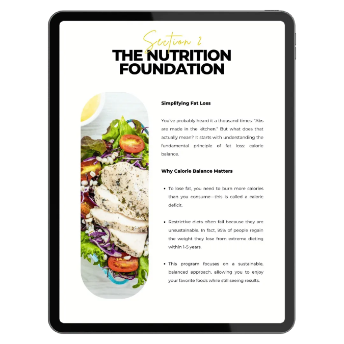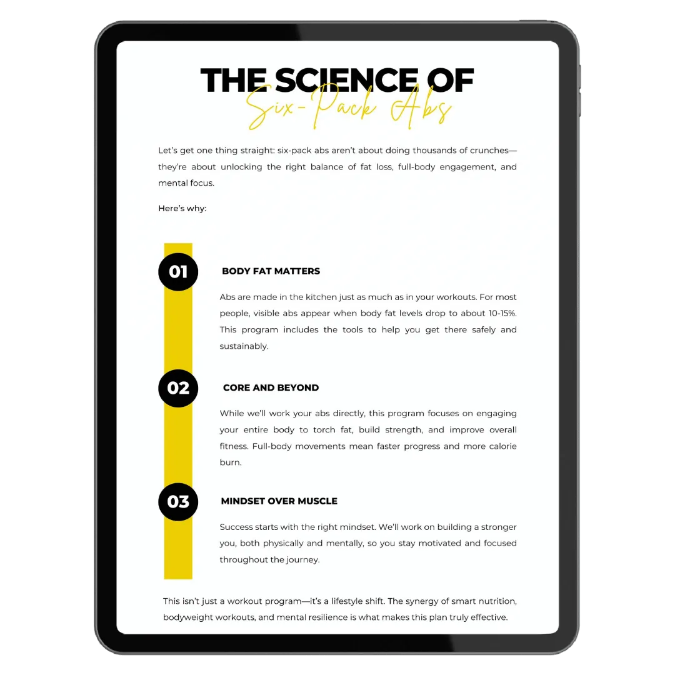 Precision Nutrition Plan: The tailored nutrition strategy focuses on burning fat and building lean muscle with sustainable eating habits. Designed to hit the abs visibility threshold, the plan balances macronutrients and supports long-term results without extreme restrictions.